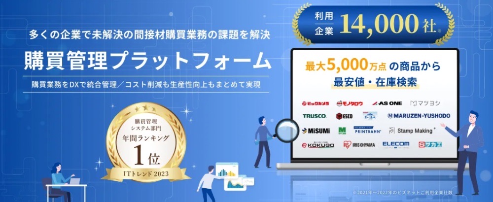 間接材に特化した購買管理システムなら、14,000社以上の企業様にご利用いただいているビズネットの「購買管理プラットフォーム」がおすすめです。「購買管理プラットフォーム」の特徴は以下のとおりです。