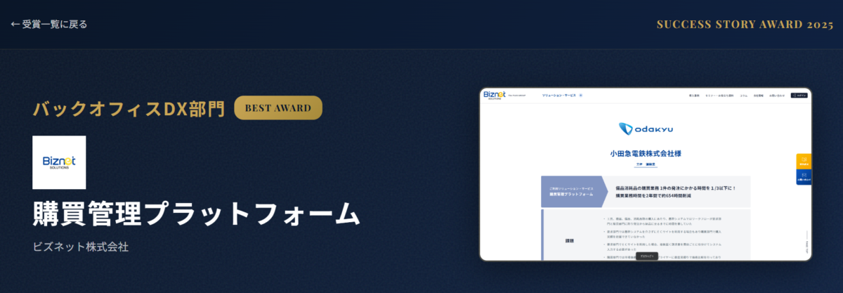 2025年に国内で実施されたSaaS/ITサービス導入事例を対象とした「SUCCESS STORY AWARD 2025」において、特に優れた成果を上げた取り組みとして評価され、バックオフィスDX部門のベストアワード(第1位)を受賞しました。