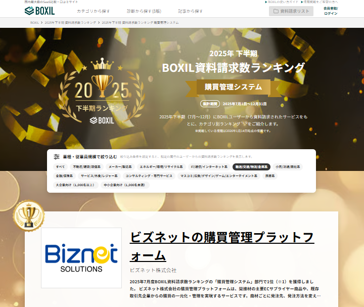 BOXILの「購買管理システム」部門の輸送・交通・物流・倉庫系業種で2025年度下半期の資料請求数ランキング1位を獲得しました。